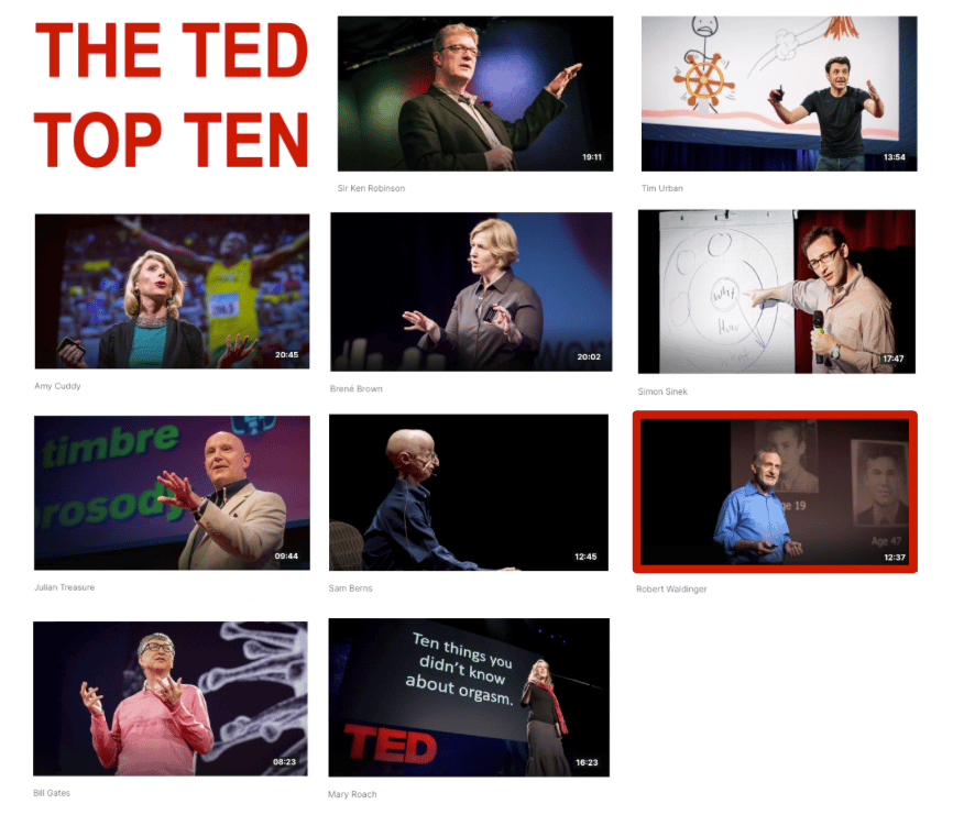 ** My clients, Harvardβs Dr. Robert Waldinger, delivered one of TED's TOP 10 TALKS of all time ( #8 with 51M views) was delivered in 2015. A detailed case study (PDF) about his talk prep, talk's impact, and much more is here.