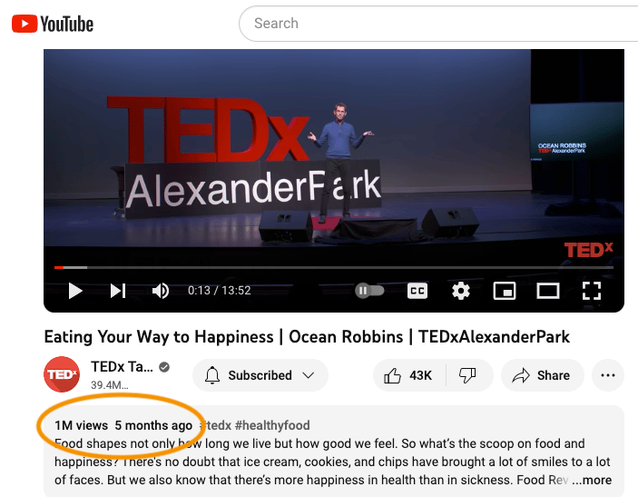 Hearty kudos to TEDx-er Ocean Robbins on tapping the 1M mark with his first talk: Eating Your Way to Happinessโ